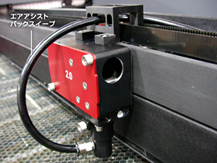 レーザーと同軸上に圧搾空気を吹き付けることにより、レーザー照射による材料の発火を抑えます。樹脂系材料においては急速冷却の効果により余熱による融解を低減します。また、光学系(レンズ)への粉塵の付着を防止します。