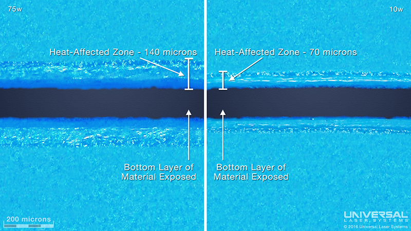 低出力レーザーなら、ゆっくりとエネルギーを送達することができるので、薄い素材を加工するのに適しています。
